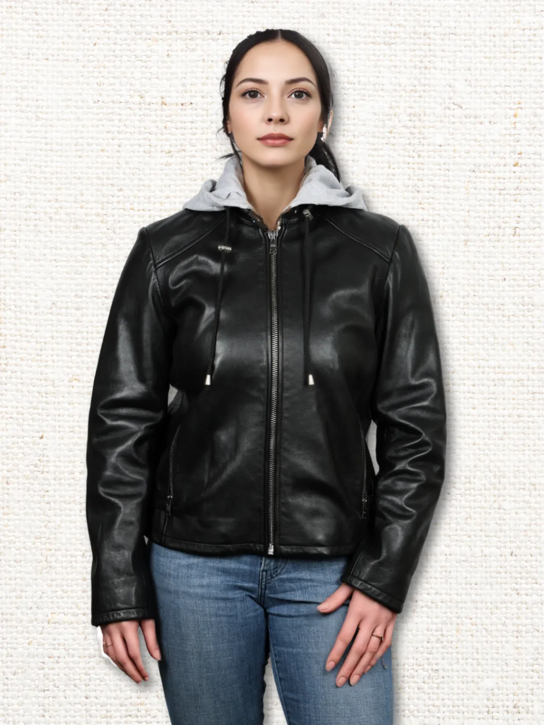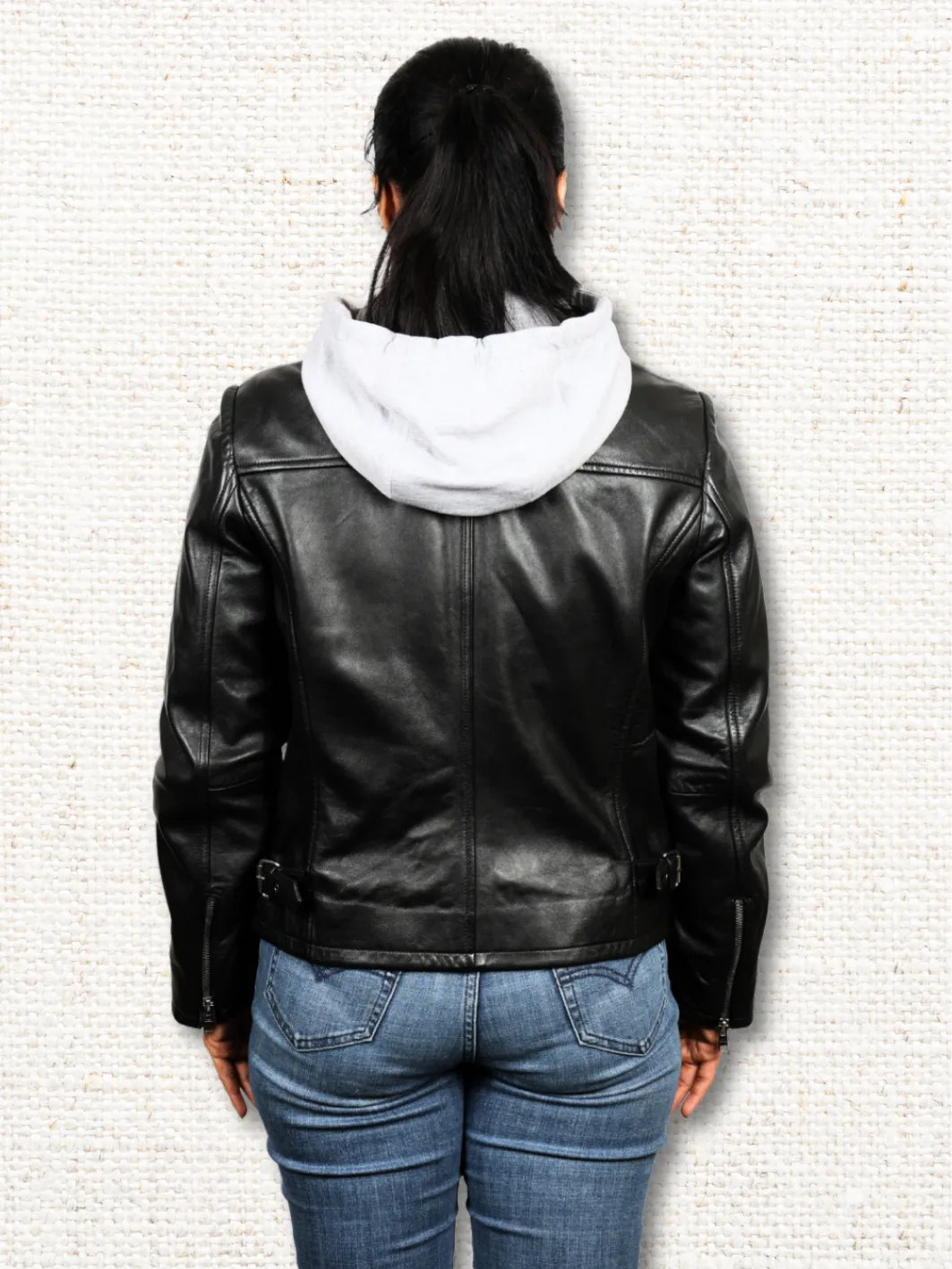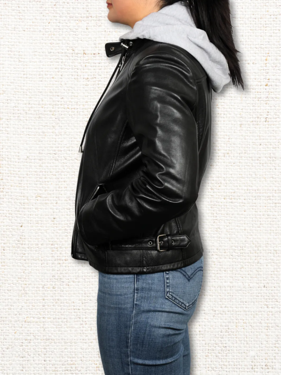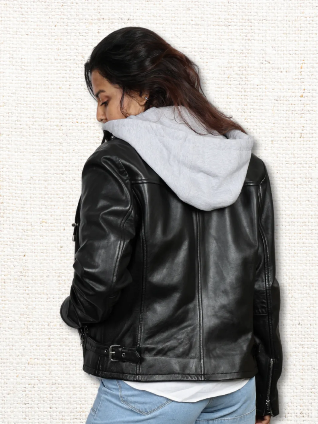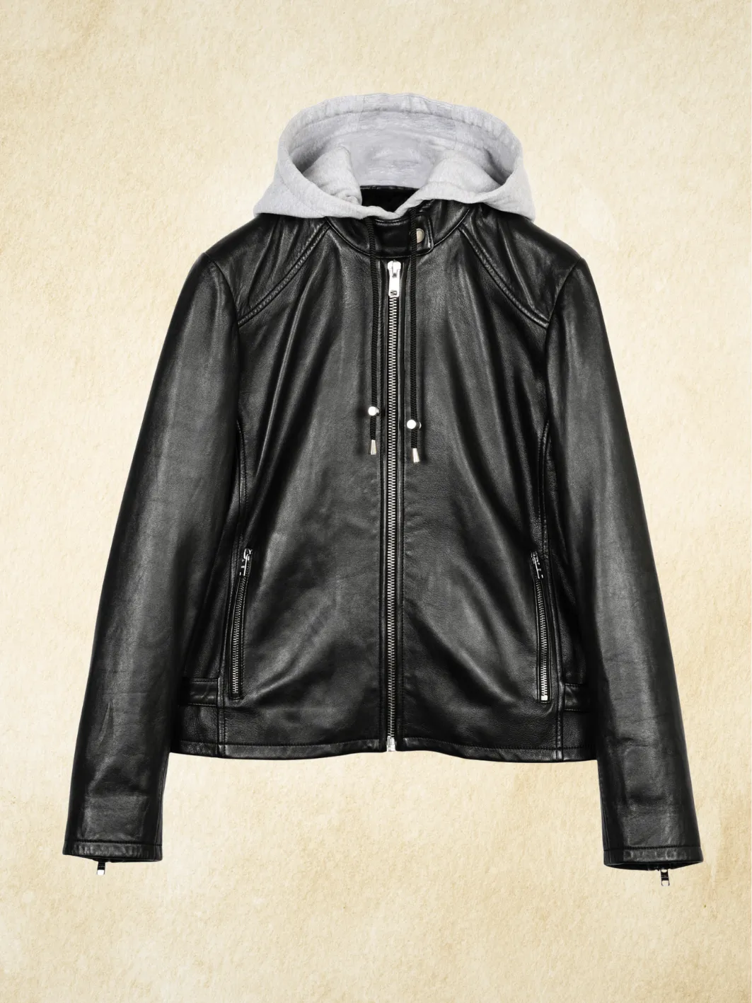 Leather Cafe Racer Jacket with a knit hood; minimalistic design without being too dramatic. Comfortable to wear in all seasons and classic design feature to stay in fashion for years to come.
