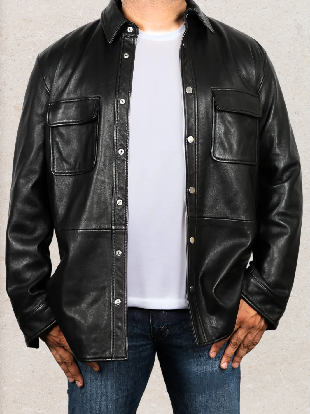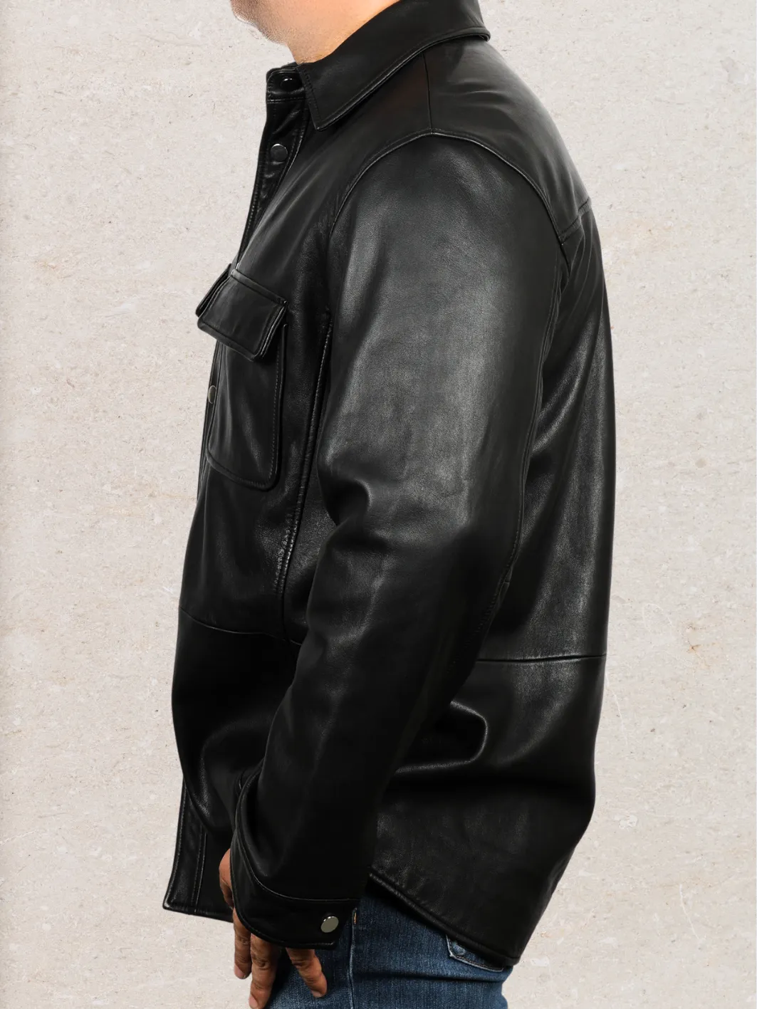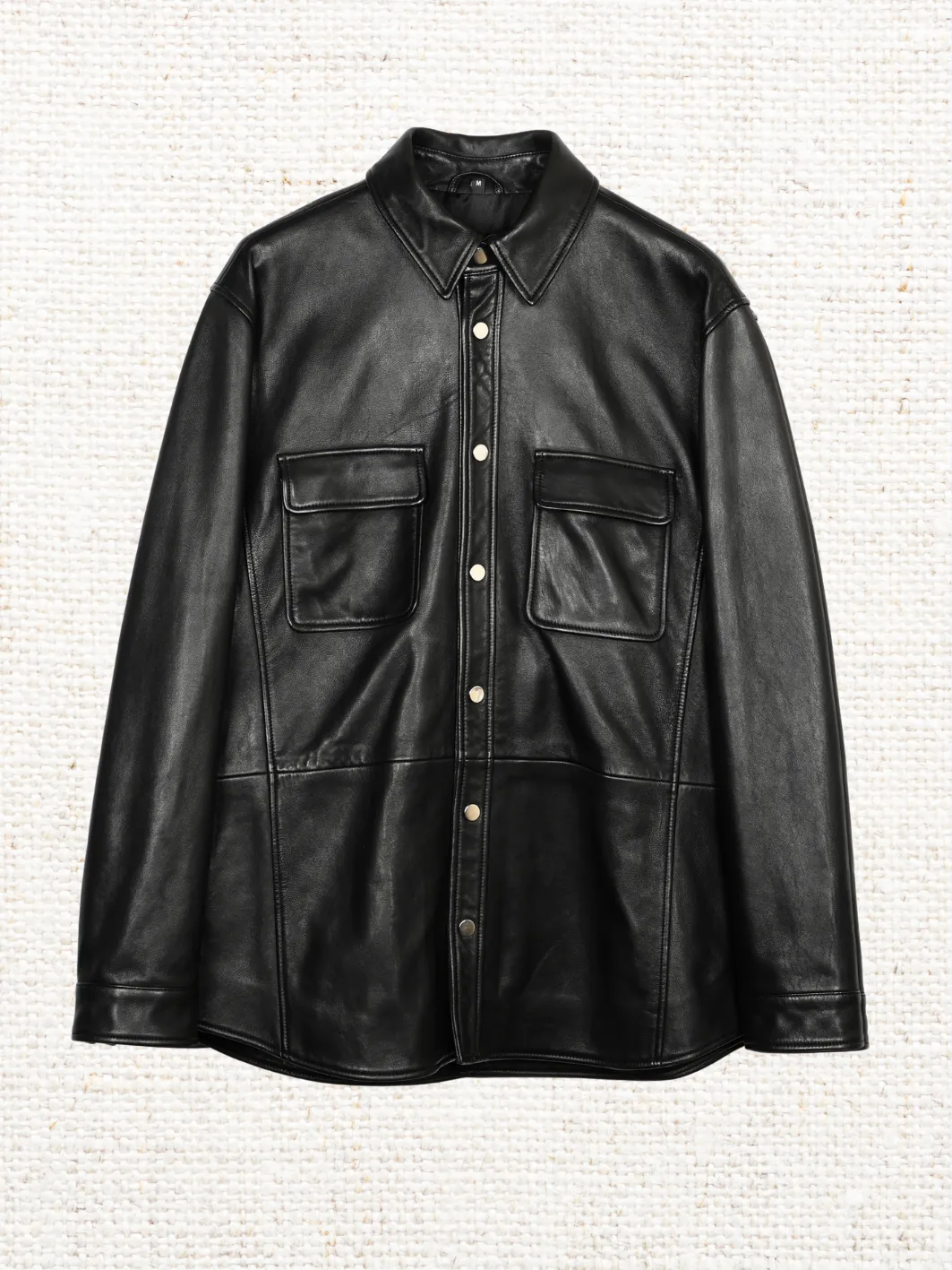 The perfect overshirt to wear with your Tees; made with soft leather, slightly thicker to beat the cold weather. Classic shirt with subtle design features. Go for a size bigger if you want a slightly oversized look