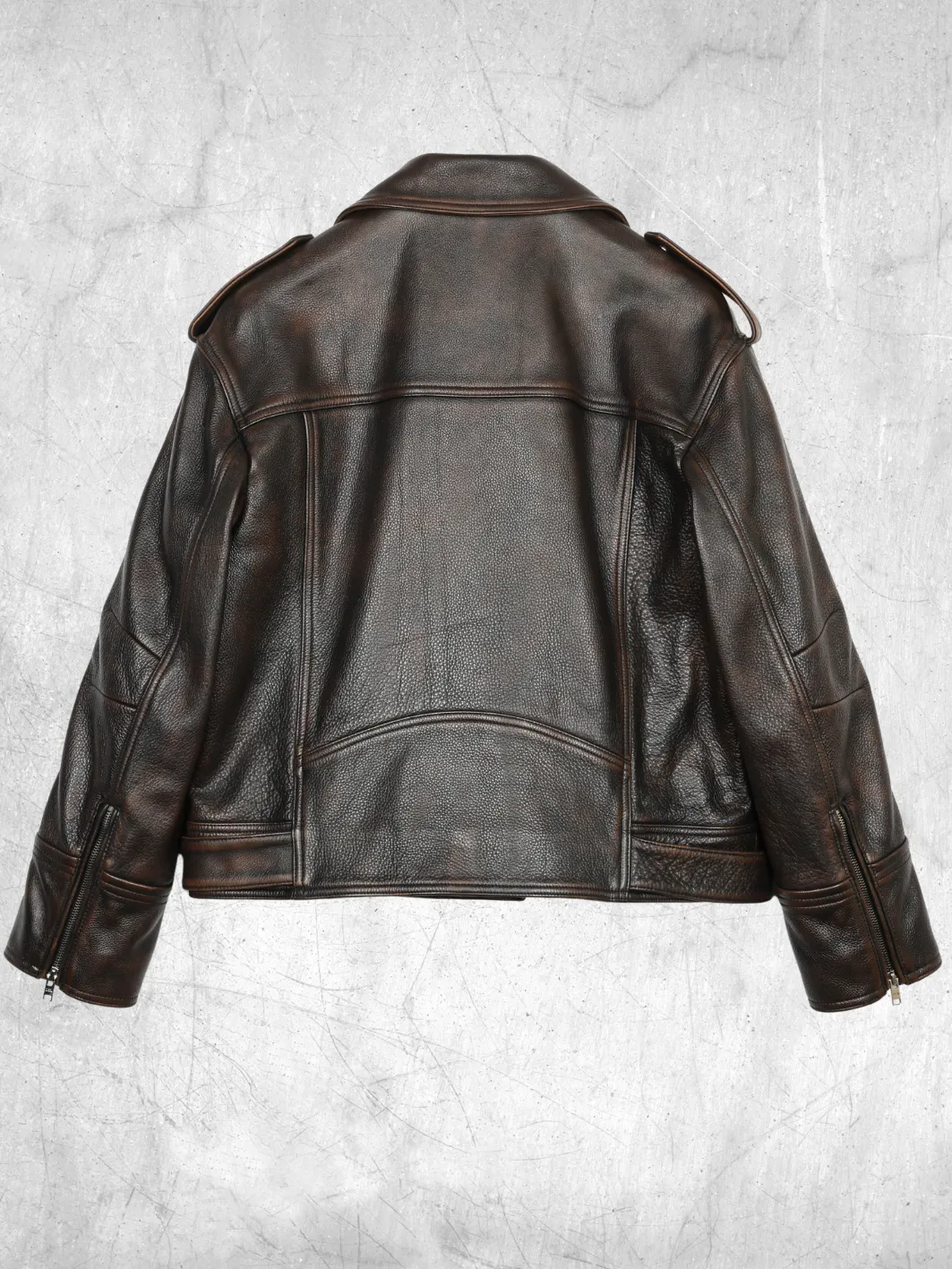 The classic moto jacket in a heavy pebbled leather with a light vintage wash and a two tone effect. Foreever in fashion design and durable leather to withstand years of wear. With every wear the leather would enhance the look of the jacket.