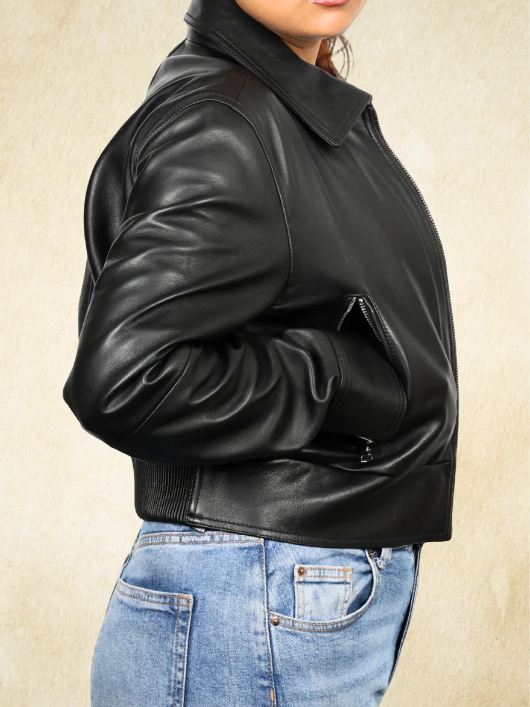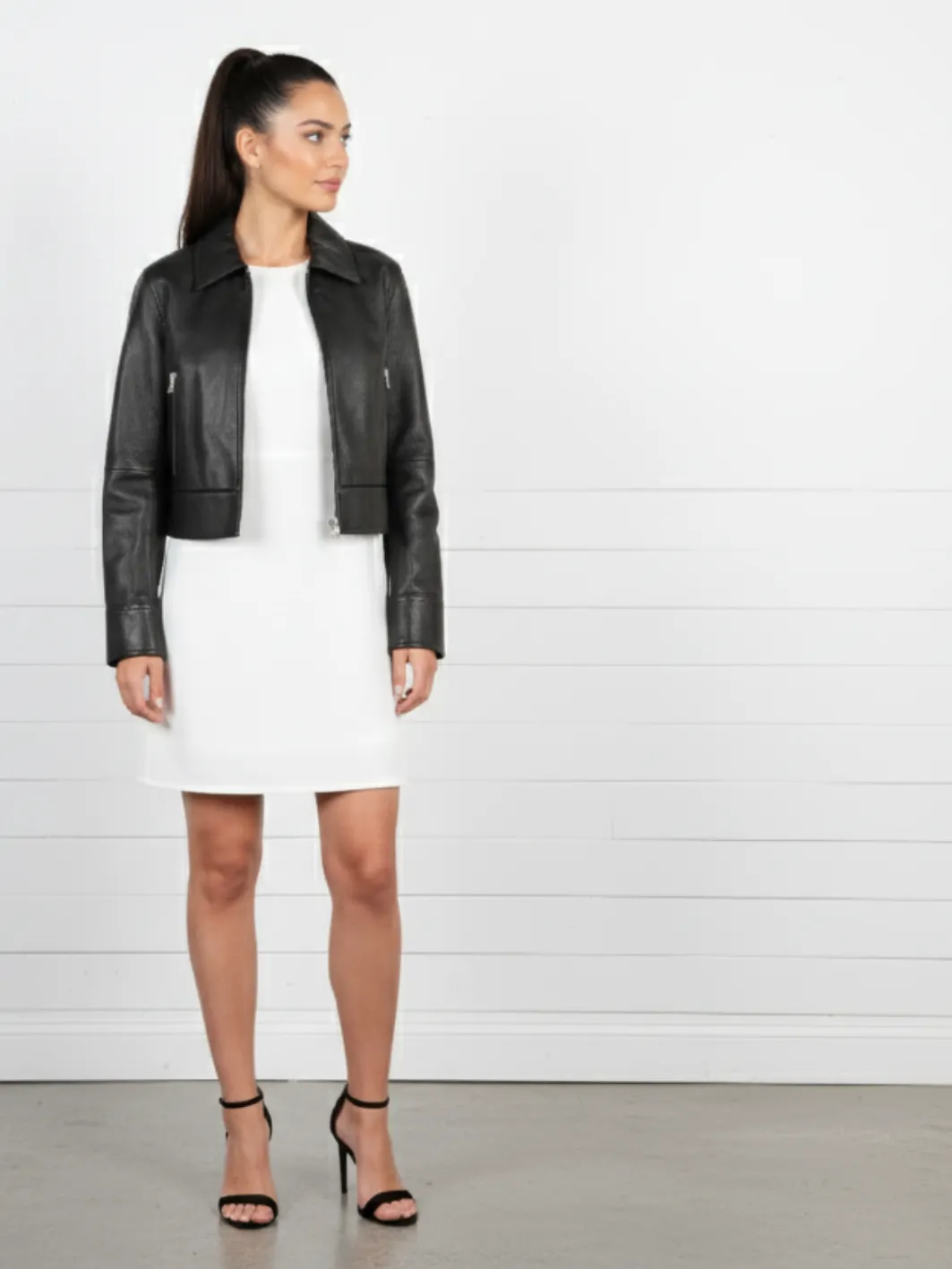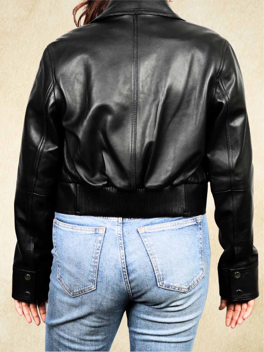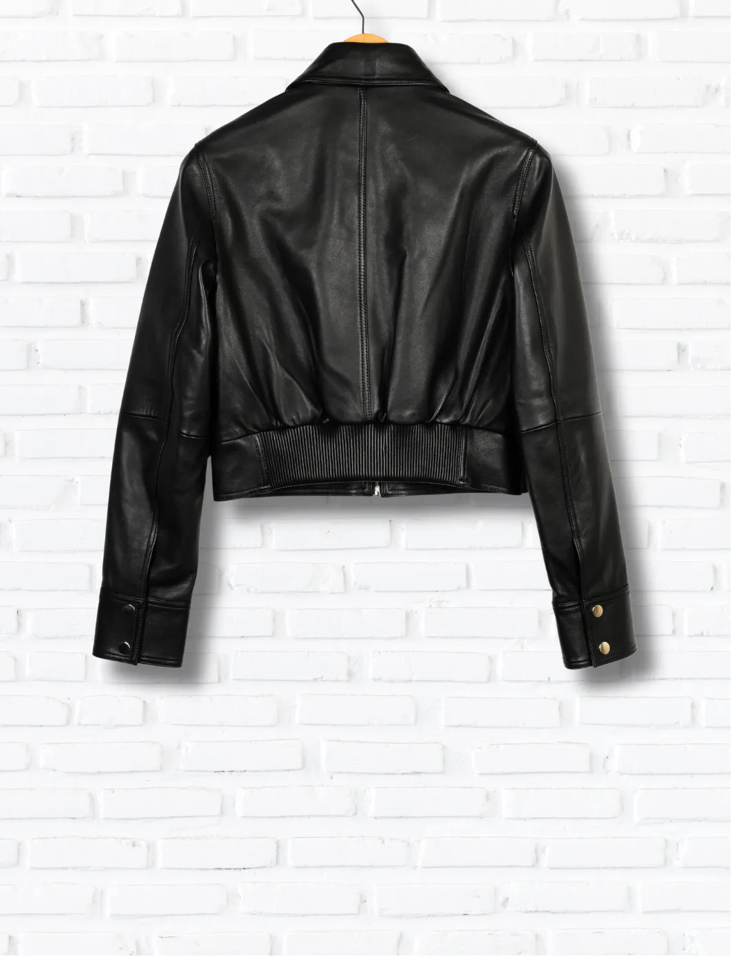 The cool cropped jacket withh long sleeves and a leather ribbing at the back making the jacket a combination of a shirt collar cropped jacket in a bomber frame!