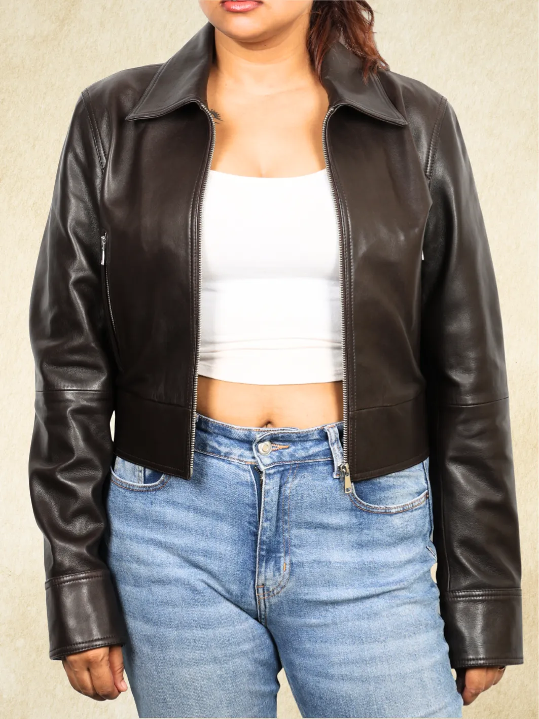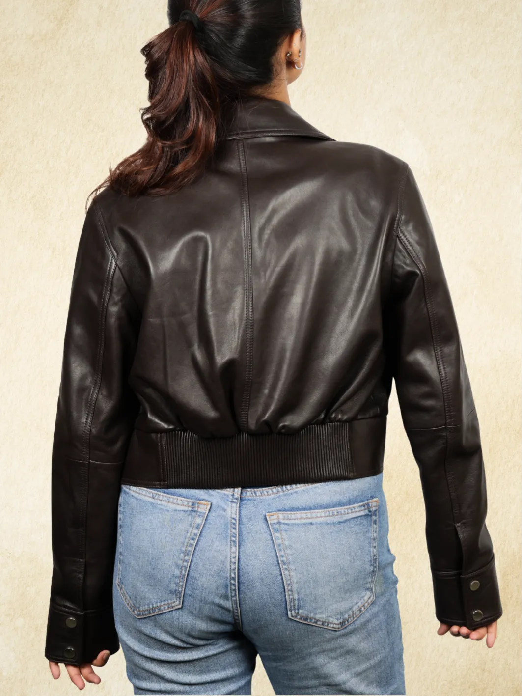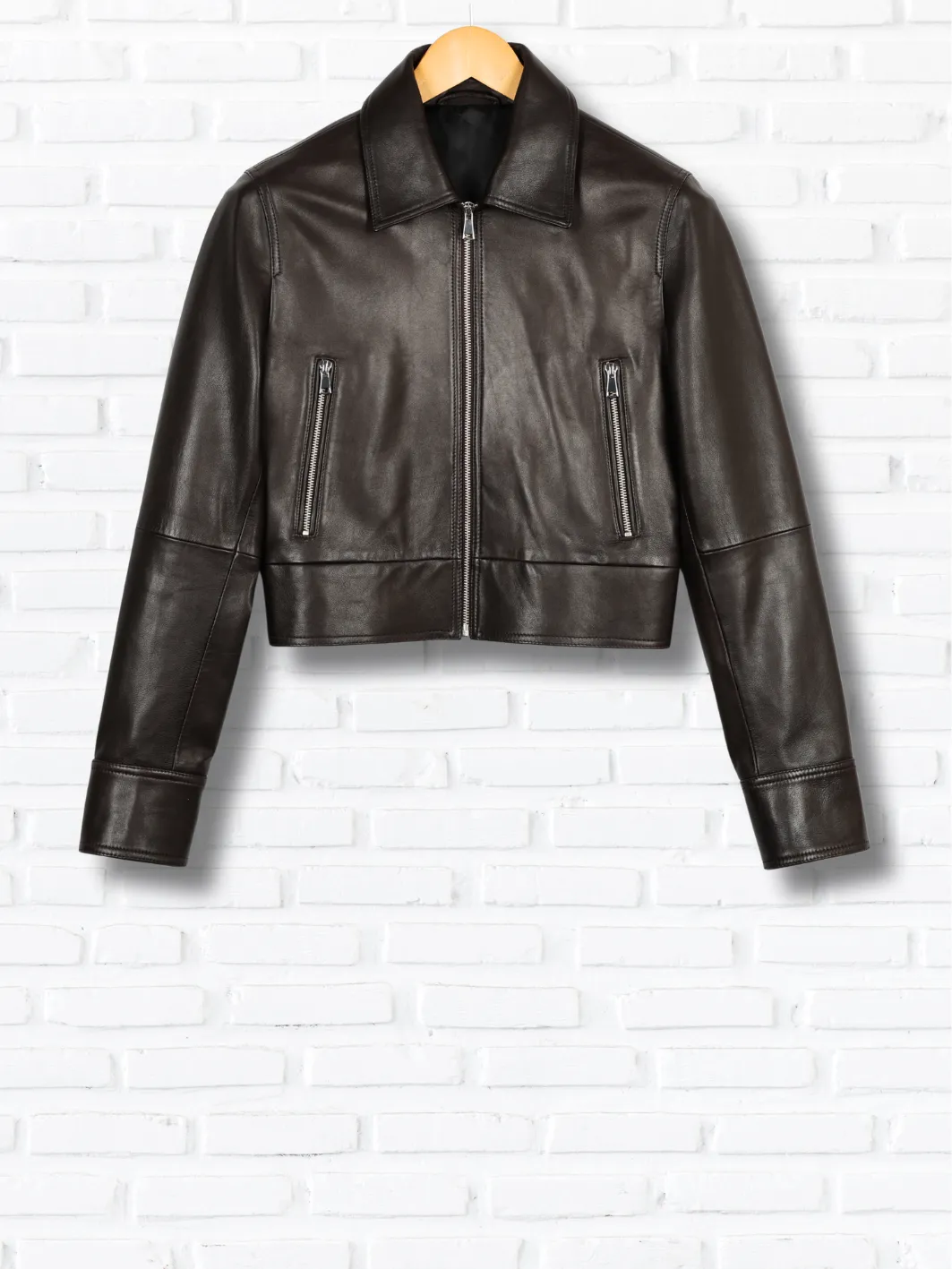 HAIDEE Leather Cropped Bomber Jacket Choco