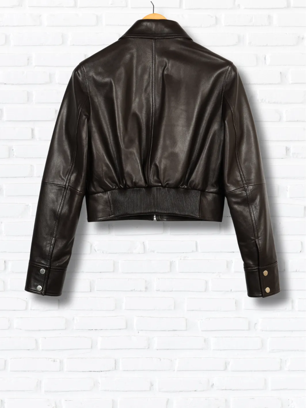 The cool cropped jacket withh long sleeves and a leather ribbing at the back making the jacket a combination of a shirt collar cropped jacket in a bomber frame!