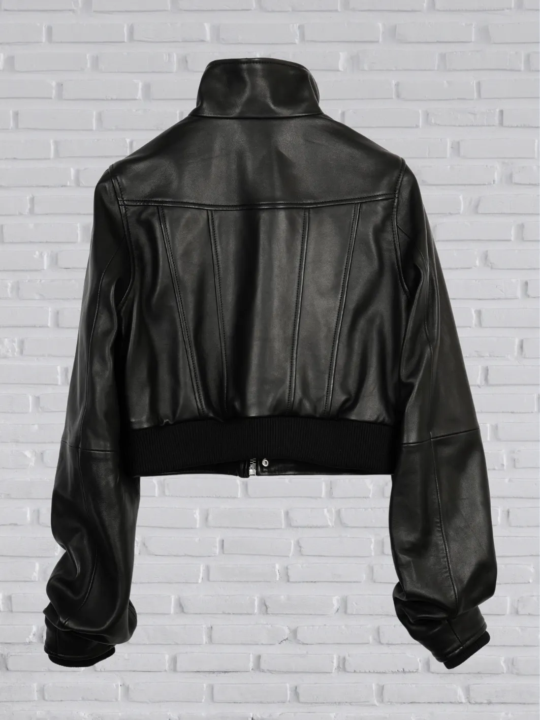 Minimal design features yet stylish, Cropped Leather jacket with a high collar and long sleeves with tailored gathers. The optically extravagant sleeve construction along with the more fitted and cropped body makes it a style to look out for.