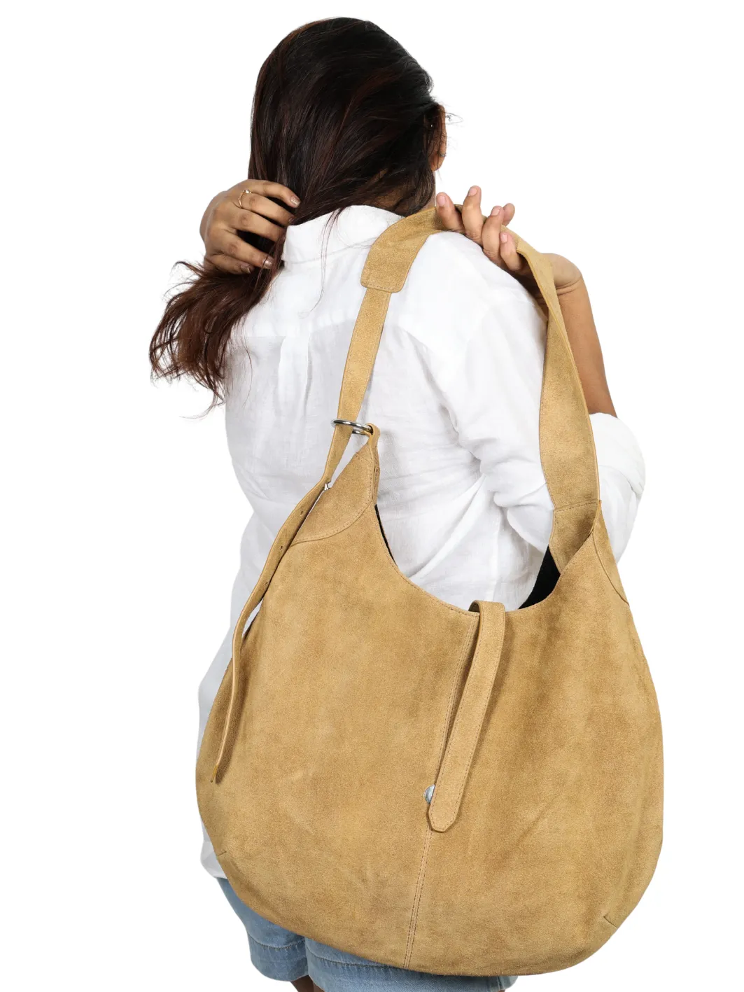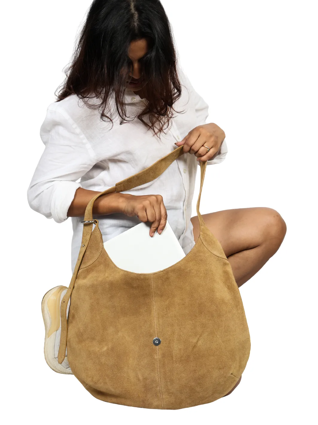 Robust, spacious yet soft and supple Suede Hobo in a subtle mustard color and contrasting Black lining. Stylish and useful with an adjustable shoulder strap to wear it over the shoulder or simply hang it down when you are on the go.