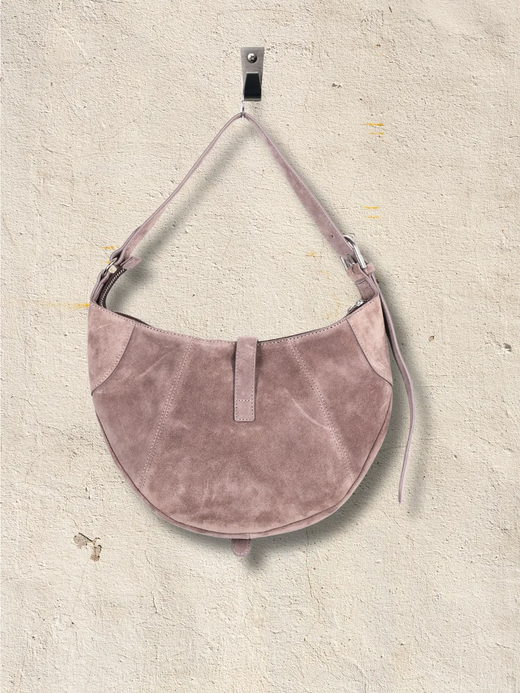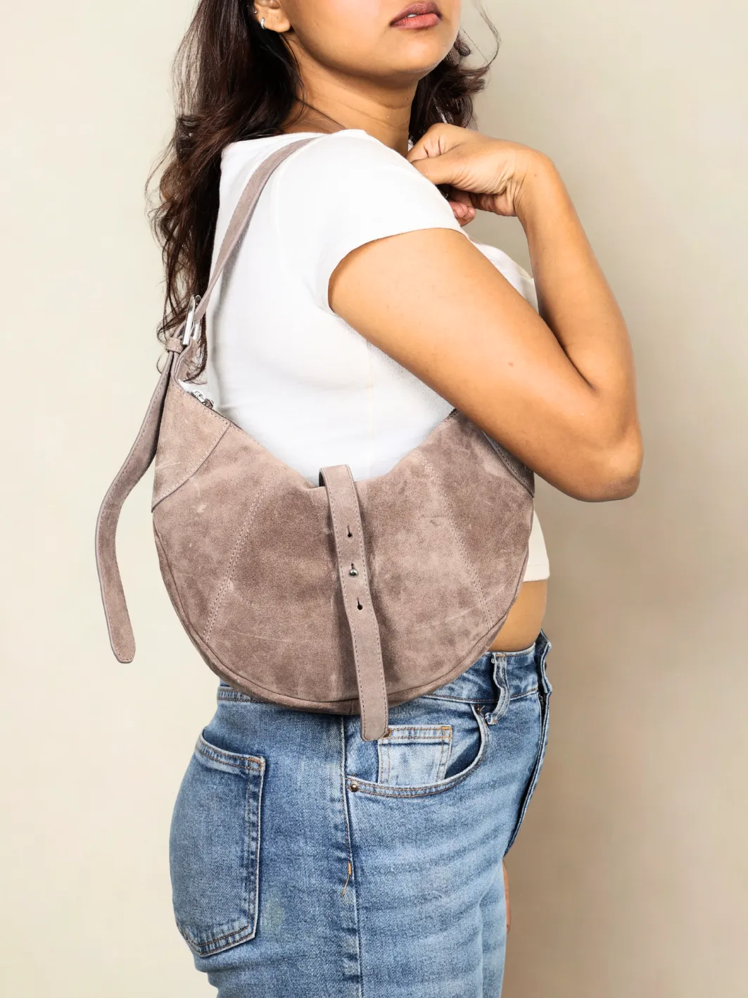 Suede satchel in the shape of the crescent moon. Slouchy design for style and comfort and with soft and supple yet firm suede leather.