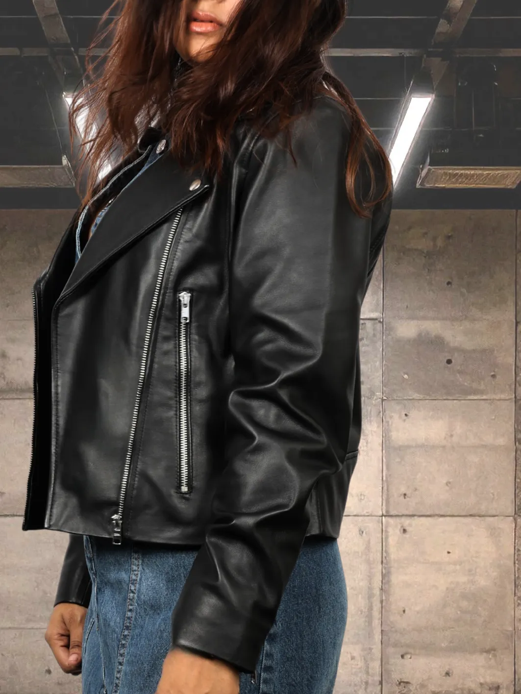 Short length biker jacket with a comfort fit; buy a size bigger if you want to layer with light warm clothing. Looks amazing when worn with almost anything, from dresses and partywear to fitted denims and a basic tee - zipped up or un-zipped.
